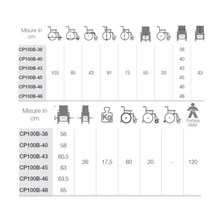 Telaio stabilizzante in acciaio verniciato, crociera singola, seduta e schienale in nylon nero, imbottito e lavabile, tasca portadocumenti sul retro. Ruote posteriori in alluminio a razzi, con gomme nere in PU senza camera d’aria e corrimano in acciaio verniciato nero. Ruote anteriori nere in PVC con forcella in acciaio. Braccioli corti ribaltabili con imbottitura in nylon nero. Pedane estraibili regolabili in lunghezza con pedana in plastica nera e cinturino ferma-tallone.