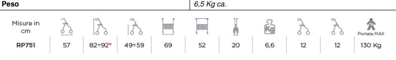 Con impugnature imbottite anatomiche. Regolabile in altezza ogni 2,5 cm. Sedile ribaltabile fissato alle barre anteriori con appoggio sui traversini laterali schienale in stoffa.