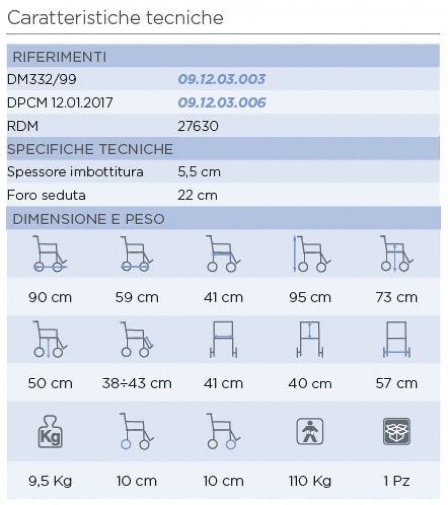 Struttura totalmente in alluminio anodizzato, braccioli ribaltabili, pedane ribaltabili lateralmente, estraibili e regolabili in lunghezza. Sedile e schienale imbottiti in PVC termosaldato. 4 ruote piroettanti di cui le anteriori con freno Ø da 10 cm.